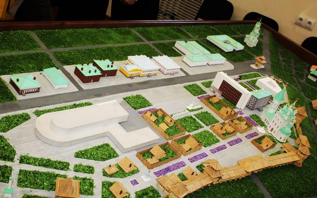 «Во время работы над проектом отдельным этапом стала сборка соборов. Особое внимание уделялось деталям крыш. Большая часть была выполнена из цветной бумаги. На начальном этапе листы из легких материалов были прикреплены к деревянным основаниям, что позволило получить прочную и ровную базу для дальнейшего моделирования. Завершающим этапом стала работа над ландшафтом. Участки озеленения покрывались опилками и окрашивались».
