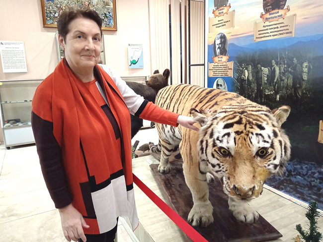 …ко второму тигру! Тот «ждал» в краеведческом музее. Я не особо вникала в программу экскурсии, ведь намеревалась лишь «побывать», так что внутрь вошла спокойно. Но тут растаяла! Красавец тигр, светло-рыжий, полосатый, с густой шерстью – пусть и чучело, но таким он родным показался. Фото в профиль, фас, у хвоста, за ухом… Все-таки уссурийский тигр – зверь царской породы!