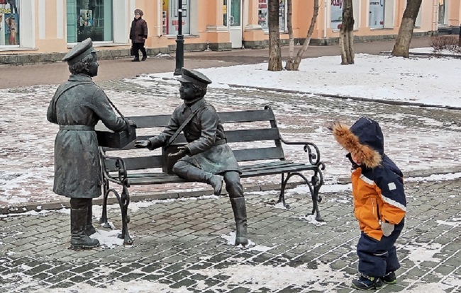 «Причем здесь мальчишки на скамейке?» – возник вопрос с первых шагов по местному Арбату (участку улицы Тимирязева). Другие фигуры – городовой с собачкой и дама с зонтиком из XIX века – были «к лицу» старинному кварталу: сочетались с бывшими доходными домами, торговыми рядами, банками, конторами фирм. А мальчишки…