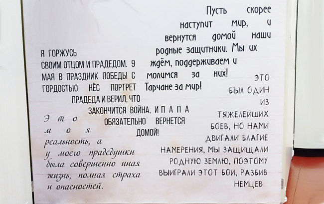 Как создавалась выставка? В рамках выставочного проекта «От Бреста до Донбасса. Связь поколений» был объявлен конкурс статей и очерков для сборника «Тарчане ZA мир». На основе поступивших 26 статей и очерков была смонтирована выставка-инсталляция. Комиссия определила авторов лучших работ. Ими стали Полина ЮДИНА, Жан КОСОЛАПОВ, Алексей ДЕКЕТ, Матвей ИСУПОВ. В январе 2026 года из статей и очерков также будет напечатан сборник «Тарчане ZA мир». В дни празднования Дня защитника Отечества всем авторам будет вручены книги.