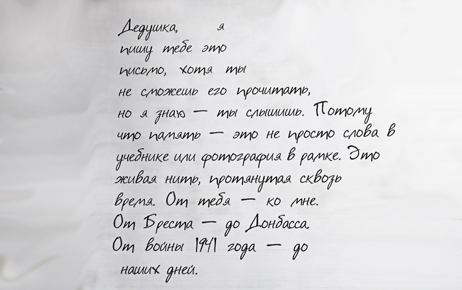 «Дедушка, я пишу тебе письмо, хотя ты не сможешь его прочитать, но я знаю – ты слышишь. Потому что память – это не просто слова в учебнике или фотография в рамке. Это живая нить, протянутая сквозь время. От тебя – ко мне. От Бреста – до Донбасса, от войны 1941 года – до наших дней».