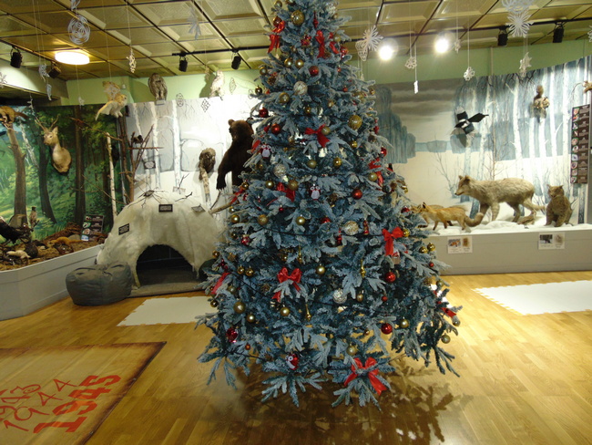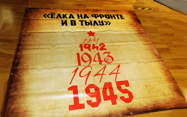 В зале музея установлена новогодняя ёлка в стиле времен Великой Отечественной войны, украшенная красными бантиками вместо игрушек.