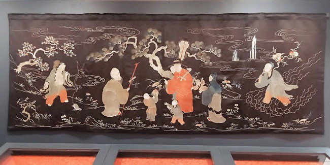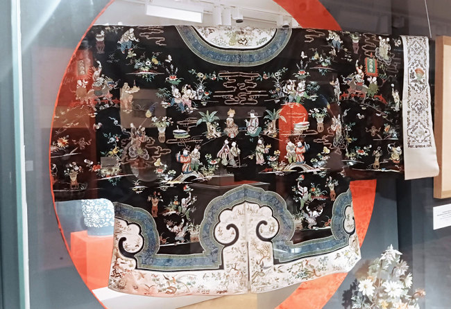 Семейное счастье показывается на выставке через свадебную и праздничную одежду, которая чрезвычайно красочна, особенно женские кофты. На одной из них, расшитой сценами с играющими мальчиками, можно встретить изображение цилиня. В китайской мифологии этот фантастический персонаж связан с появлением сыновей, а иметь много сыновей тоже считалось счастьем. Цилинь здесь как раз несет на спине мальчика, то есть это своего рода аналог аиста в европейской культуре.