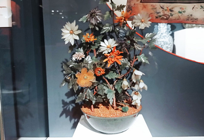 Посетители омской выставки станут первыми, кто увидят роскошные парные кашпо с цветущими хризантемами, сделанные в императорских мастерских (XVIII век). Кашпо выполнены из нефрита, а очень реалистичные цветы – из розового аметиста, кварца, коралла. Хризантема связана с пожеланиями богатого урожая и успехов в любых делах.