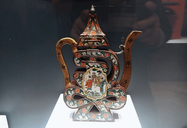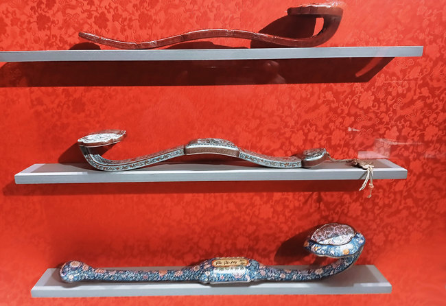 Еще один предмет императорского уровня – подарочный жезл жуи. Это некий сакральный предмет, который, как считалось, исполняет желания (название «жуи» буквально переводится: «чего пожелаете»). Такой жезл могли подарить на свадьбу, день рождения или какой-то другой праздник, и он занимал почетное место в доме. На выставке представлено пять жезлов: нефритовый, деревянный, фарфоровый, из резного лака, из расписной эмали. Если опять же переводить на европейскую традицию, жезл жуи выполнял функцию волшебной палочки, поэтому можно попробовать загадать возле него желание.
