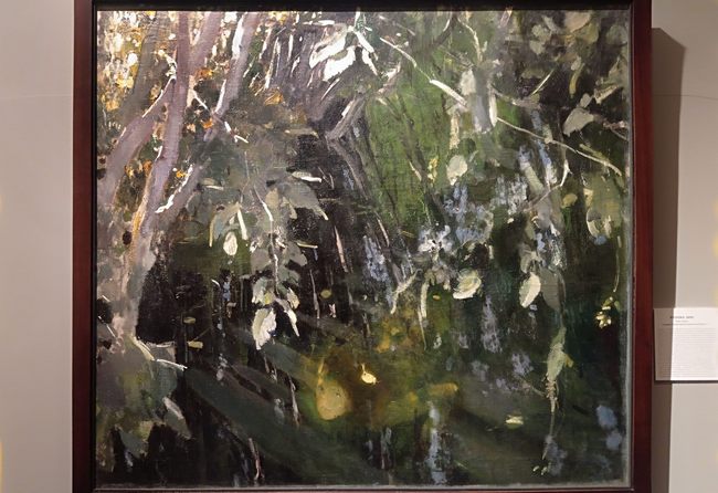 Что касается Домотканова, там создана самая удивительная работа Валентина Серова «Русалка». Она тоже поначалу кажется просто пейзажем, видом заросшего пруда, не сразу внизу картины под водой проступает женское лицо.