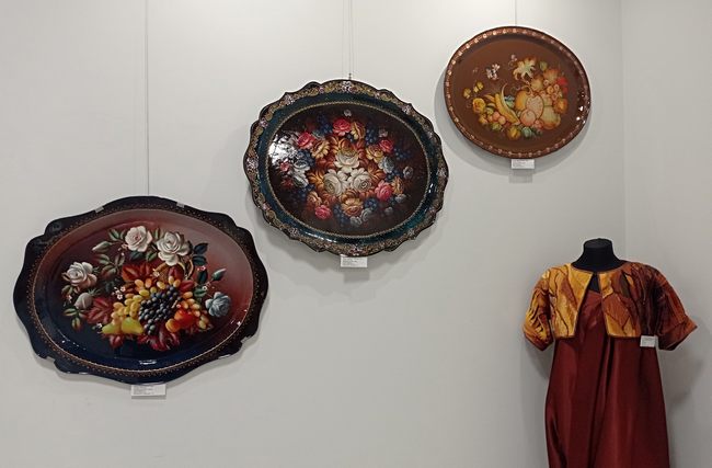 На выставке показаны дипломные работы студентов разных лет. Здесь более 300 предметов: золотое шитье и литье, кружево, подносы в жостовской росписи, гобелен, резьба по кости, художественная ковка, вышивка, ювелирные изделия с ростовской финифтью и многое другое. Все вместе создает очень яркую, насыщенную экспозицию.