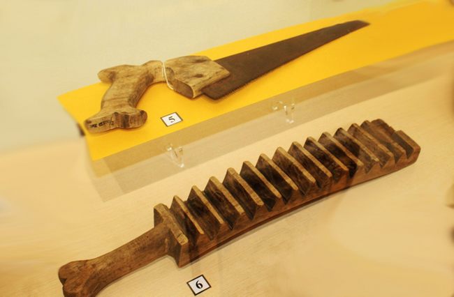 На перовом стенде выставлены предметы быта. Во время проведения массовых мероприятий их использовали как музыкальные инструменты. Например, ножовки, пилы, рубель для глажки белья и другие.