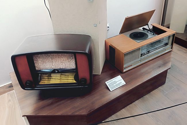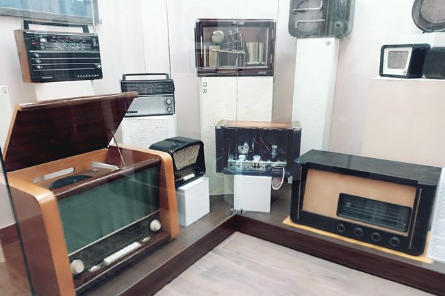 На стенде представлены радиоприёмники: громкоговоритель «Чайка» (1950–1960), громкоговоритель «Чайка-4» (Омск, 1956), радиоприёмник «VV 663-2» (Таллинн, 1950), радиоприёмник «Стрела» (1960), внутреннее устройство лампового радиоприёмника «Рекорд», радиоприёмник транзисторный «Океан-209» (Минск, 1976–1980).
