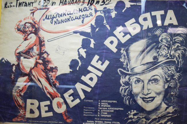 Также были размещены киноафиши. Например, музыкальной кинокомедии «Веселые ребята». На афише указывалось, что кинофильм демонстрируется в кинотеатре «Гигант». Старожилы-омичи помнят, что кинотеатр размещался в том месте, где сейчас находится сквер на улице Партизанской, а его зал вмещал до 700 зрителей.