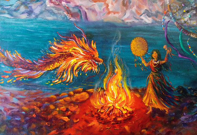 Марина МАНЬКО выставила картины «Вечер у камина», «Легенды быстрой реки», «Ванечка», «Повелитель огня», «Сказочник», «Сказ о трёхмерном карасе».
