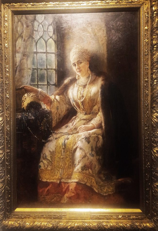 Константин Маковский, конечно, прежде всего – великолепный портретист, и на его «половине» мы видим целую галерею портретов, портретных изображений. В том числе знаменитую «Боярыню у окна» – картину, для которой в качестве модели выступала жена художника Юлия (работа находится в фондах Омского музея имени М.А. Врубеля).
