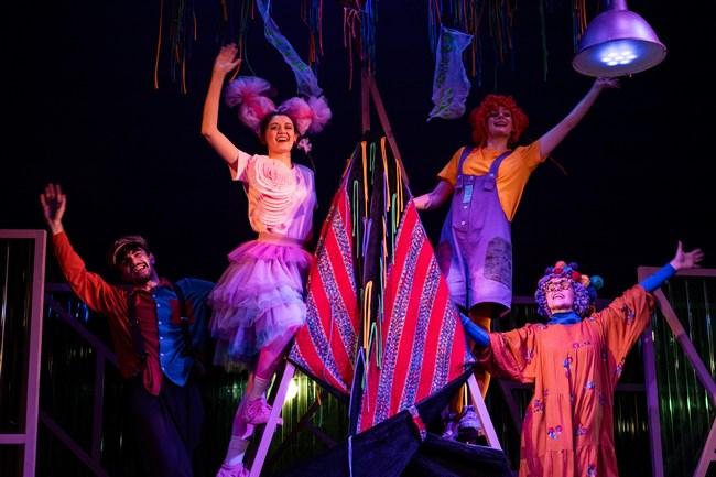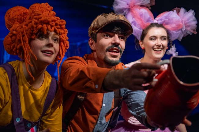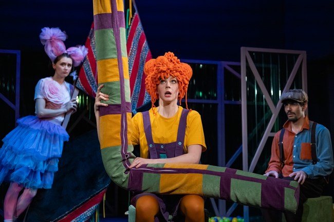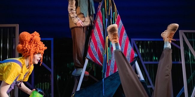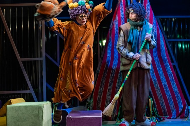 Жанр спектакля обозначен его постановщиком Евгением ТРУБКИНЫМ как балаган. И это действительно разудалое действо, помещенное в пестрые декорации (художник-постановщик Алексей ОСИПОВ, художники-декораторы Ольга ДАГАЕВА, Татьяна ИГНАТЬЕВА, Арина ГРИГОРЬЕВА). Но спектакль также можно назвать и детским театром абсурда, поскольку налицо главные инструменты такого театра – метафора и нелепость.