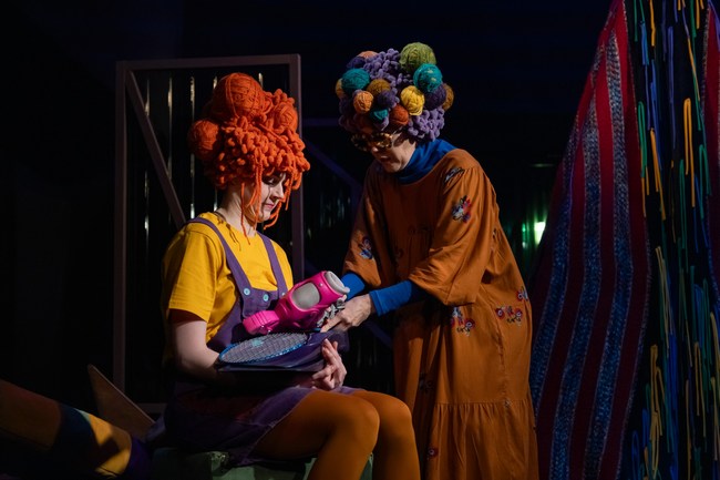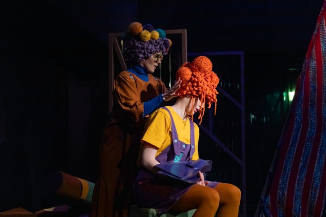 Интересная придумка – парики из клубков разноцветной пряжи, которые и гротескны, и символичны. Аккуратно уложенные у Светланы Маргаритовны, они напоминают о домашнем уюте, о классической бабушкиной прическе. У Лизы это беспорядок на голове, а никак не находящий свое место клубок – та самая косичка, которая кажется ей то тугой, то кривой.