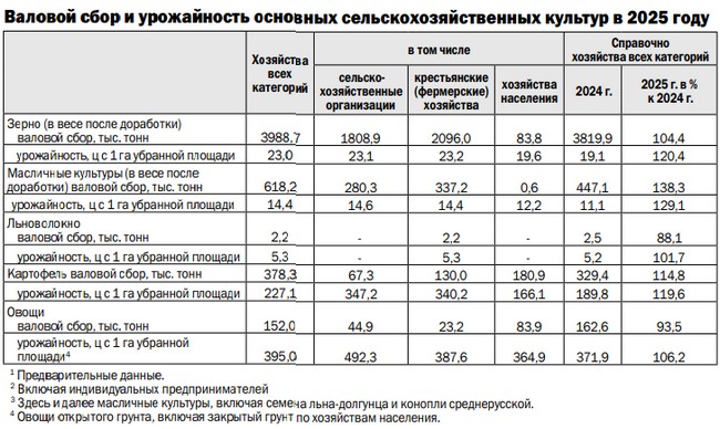 Растениеводство. В 2025 году, по предварительным данным, валовой сбор зерна (в весе после доработки) в хозяйствах всех категорий (сельскохозяйственные организации, крестьянские (фермерские) хозяйства, хозяйства населения) составлял 3988,7 тыс. тонн (104,4 % к 2024 г.).