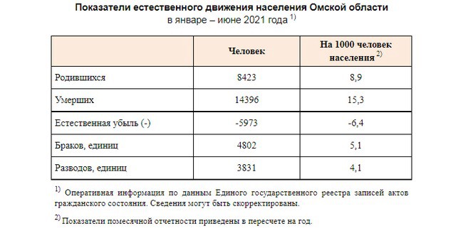 В первом полугодии 2021 года, с января по июнь, в Омской области родилось 8423 младенца и умерло 14396 человек разных возрастов. Омскстат информирует, что естественная убыль населения составила 5873 человека. Также за этот период было заключено 4802 брака и оформлен 3831 развод.