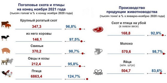 На конец ноября Омскстат насчитал в Омской области 6,9 миллиона голов птицы, 370,2 тысячи голов свиней, 347,3 тысячи голов крупного рогатого скота и 212,4 тысячи голов овец и коз. По сравнению с ноябрём 2020 года поголовье овец и коз сократилось на 4,2%, крупного рогатого скота – на 3,2%, свиней – на 1,3%.