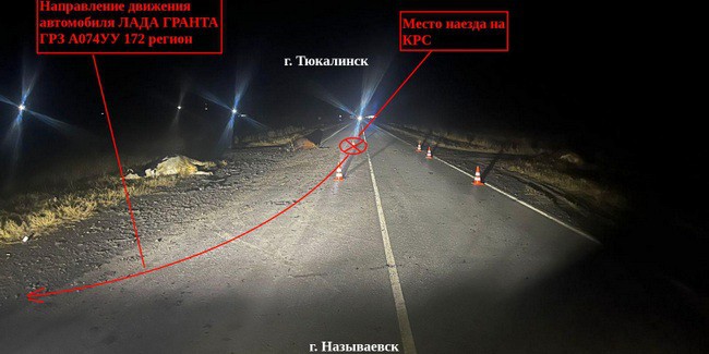 Следственно-оперативная группа ОМВД по Называевскому району вечером 21 октября осмотрела место ДТП (на фото) в районе 35-го километра трассы Называевск – Тюкалинск – Большеуки. Полицейскими предварительно установлено: 33-летний водитель автомобиля «Лада Гранта» около 18:55 сбил пять коров, переходивших дорогу. В больницу с различными травмами доставлена 29-летняя пассажирка.