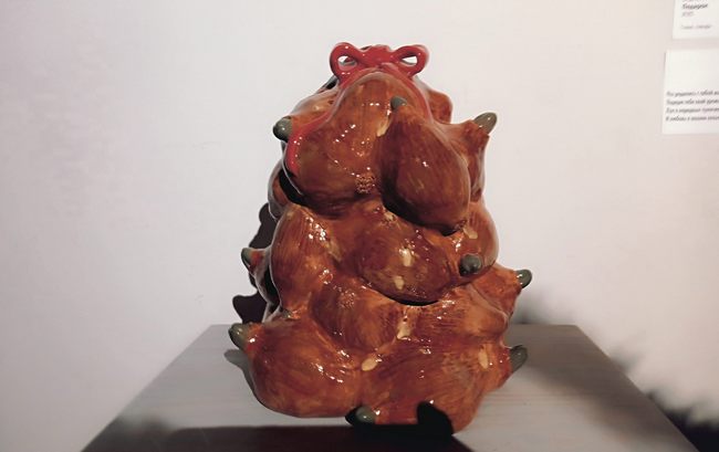 В пространстве выставки сейчас присутствует елка из золотых грецких орехов (елка из «Сказки о царе Салтане»), елка-чемодан, елка-урожай (керамическая авоська с луком).
