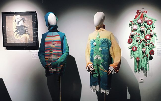 На выставке, как и в прошлый раз, большое количество текстиля, вязанных вещей. Тут елки-свитера Татьяны и Варвары МОИСЕЕВЫХ.