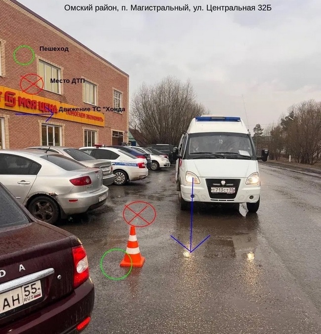 Следственно-оперативная группа ОМВД по Омскому району 7 апреля осмотрела место ДТП (на фото в тексте) напротив дома №32Б по улице Центральной в посёлке Магистральный. Полицейскими предварительно установлено: 70-летний водитель мини-фургона Honda около 17:25 сбил 17-летнюю девушку. Пострадавшей понадобилась медицинская помощь.