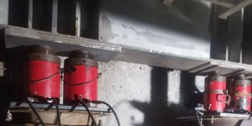 Строители подняли мост домкратами и перенесли на временные опоры в виде металлических тумб