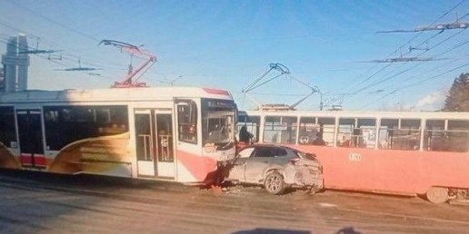 В центре Омска женщина – водитель кроссовера BMW столкнулась с двумя трамваями